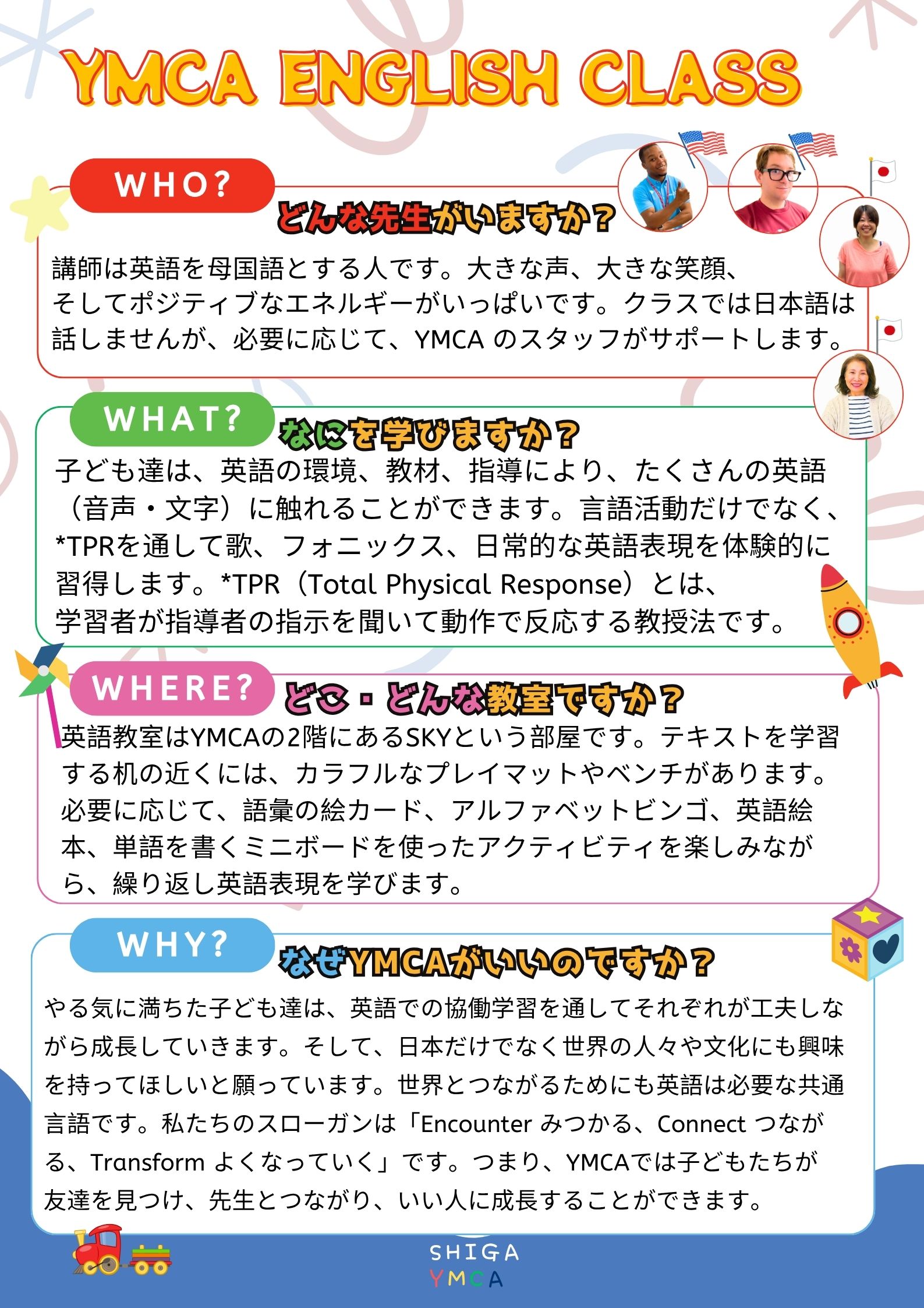 Let’s learn English! YMCAランゲージスクールは、リラックスして楽しみながら英語のコミュニケーションを学べる場所です。年齢・レベルにあった教科書と、生徒の目標明確に設定して、楽しいアクティブティーを行います。それぞれのレベルに合ったクラスを用意しているので楽しみにしていてください。*近江八幡 年間クラス42回